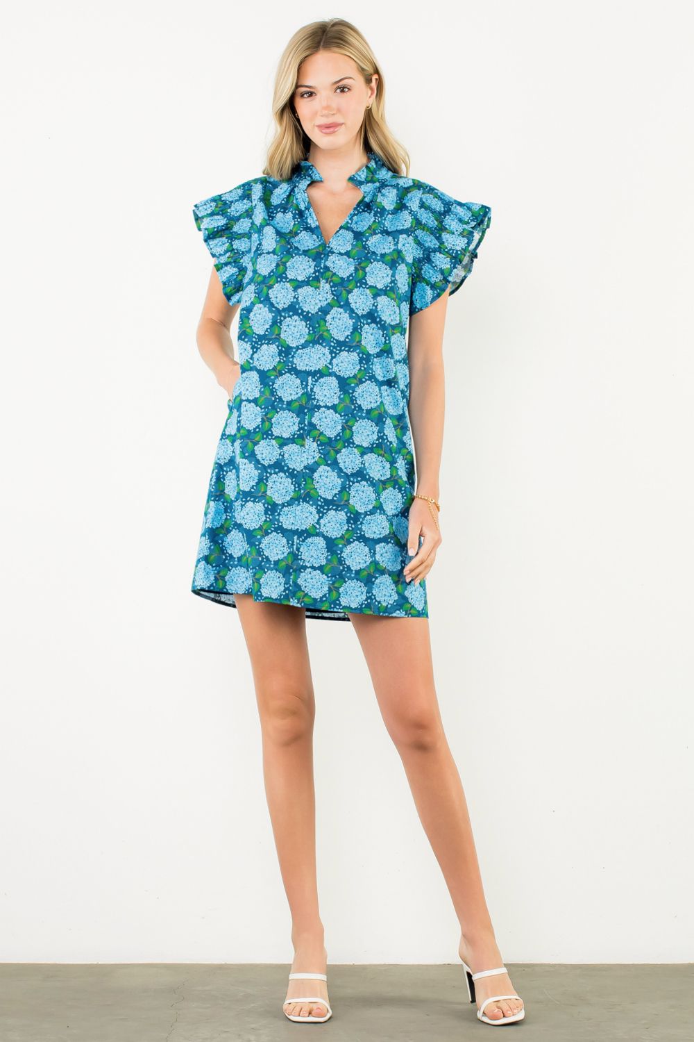THML Flutter Sleeve Hydrangea Print Dress Blue